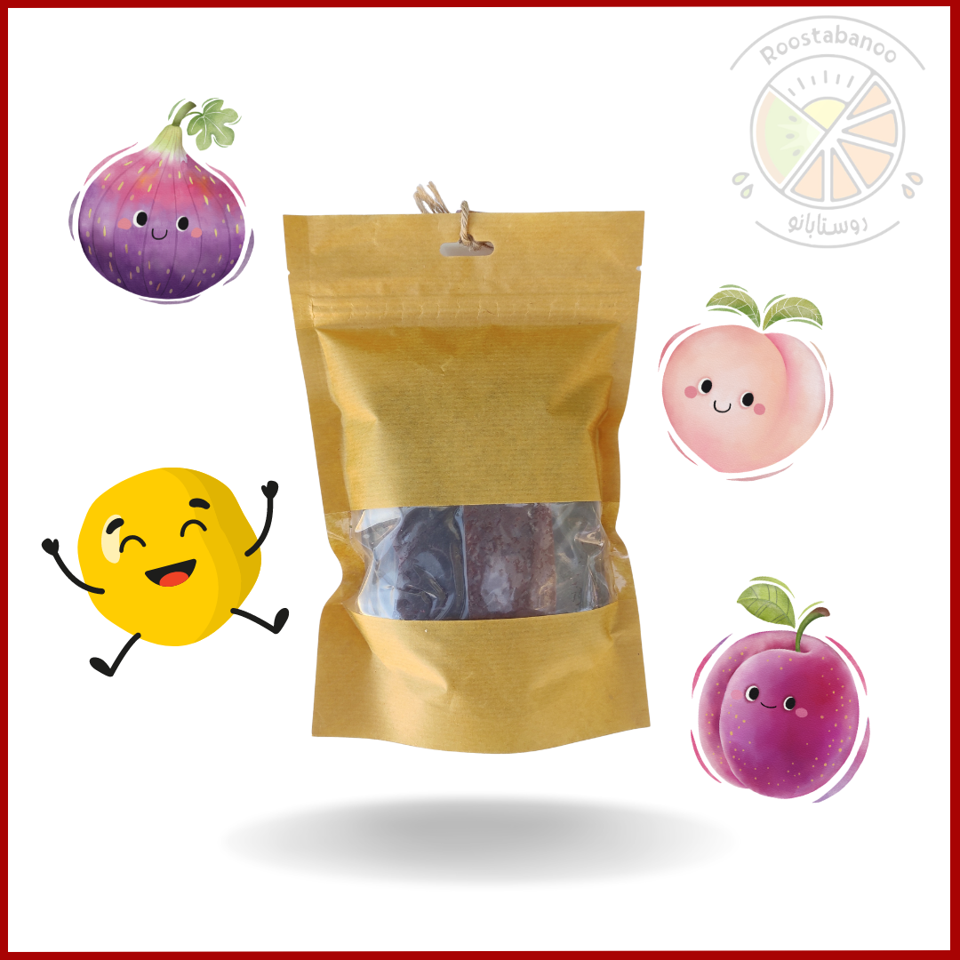 این لواشک ترکیب 4 میوه هلو،انجیر،آلو سیاه و آلو زرد می باشد. طعم این لواشک ملس رو به شیرین می باشد.