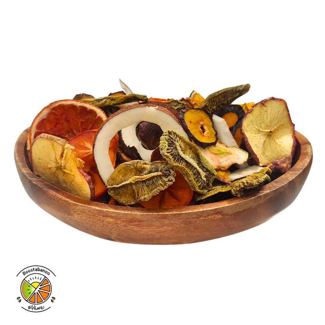 میوه خشک مخلوط 9میوه روستابانو کیوی،آلوشابلون،سیب زرد،سیب طعم دار،خرمالو،انجیر،هلو ،نارگیل و پرتقال